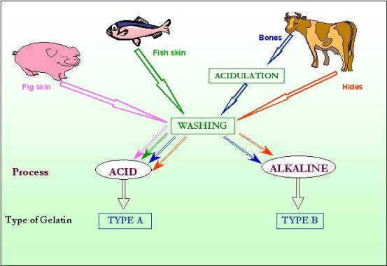 為天然可溶性蛋白質,具結膠及非結膠性,可由動物組織如:肌肉、腱、皮膚、骨頭中得到膠原質,經過水解等處理程序製成。種類依照不同動物來源,可區分為‧ 豬皮(PIG SKIN)‧ 獸皮(BOVIN HIND)‧ 獸骨(BOVIN BONE)‧ 魚皮(FISH SKIN)依照製程不同,可分為TYPE A與TYPE B明膠製造流程圖